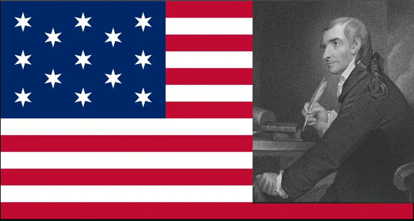 At a subsequent session of the Congress a year later, Hopkinson was honored by another distinction for which he is better known. By an act of the Second Continental Congress his design for a national flag was adopted. The resolution, passed on June 14, 1777, “resolved, that the flag of the United States be thirteen stripes, alternate red and white; that the union be thirteen stars, white in a blue field representing a new constellation.” This is why in 1949 President Harry Truman officially declared June 14th to be Flag Day.