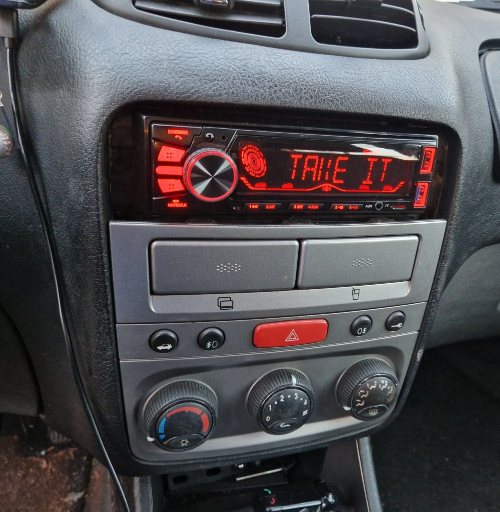 So, like most of the personnel assigned here who drive temporary, local cars, I bought a Bluetooth speaker to use when I’m driving and that I can take with me or hide in the trunk to avoid being stolen. But this introduces other problems, like how to keep it charged or where to put it when I have passengers. Controlling it while I’m driving can be a problem also. I thought it was time to replace the non-functional, interfering stereo deck. After all, it was old enough to include a CD player.