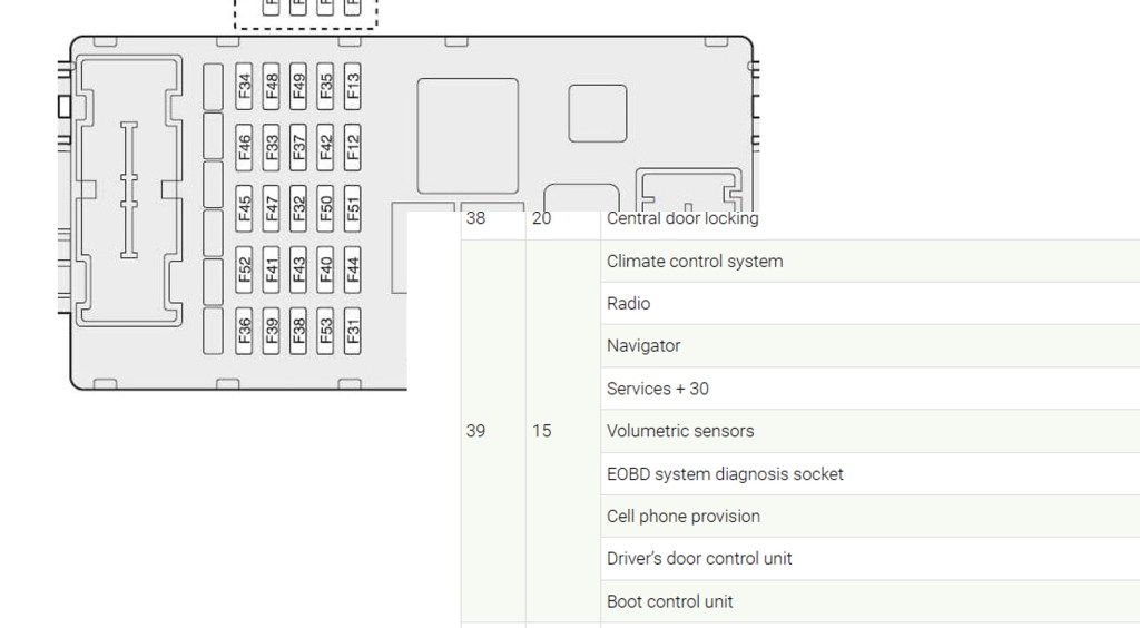 Presented with a bank of fuses, unlabeled except for their amp rating, I went back to the internet for some help and found this helpful diagram. Scanning the list of fuses and their assigned loads, I saw that fuse #39, only a 15amp fuse, could have up to 9 (!) loads, three of which were the radio, from which I’d drawn a spark that could have blown the fuse; the climate control system, which would explain the fan not blowing when I started the car; AND the driver’s door control unit, which would keep me from rolling the window down. I don’t know why ALL of those things are connected to the same 15a fuse, all I know is that ain’t right.