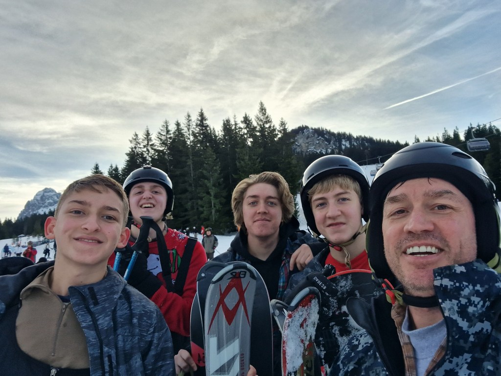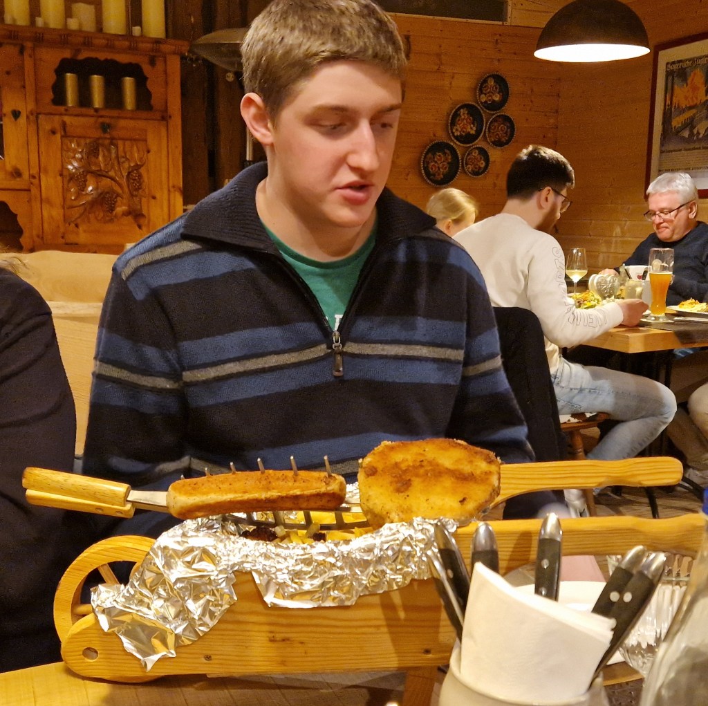Joel, Justyn, and I were on skis and ended up in a different spot than Matthew and Isaac who were on snowboards. We were together for lunch, however, at a restaurant on the mountaintop that served regional foods. We had schnitzel and sausages that we washed down with sparkling water flavored with edelweiss that was refreshing and delicious. There was delicious hot chocolate too, of course.