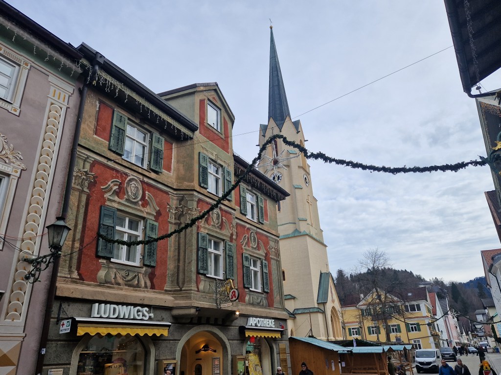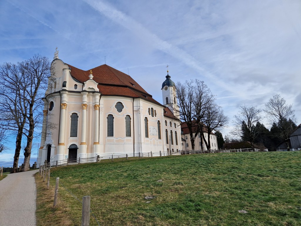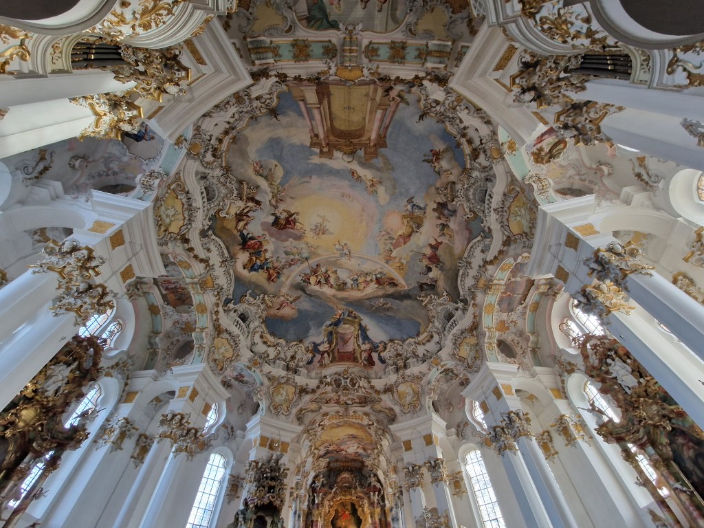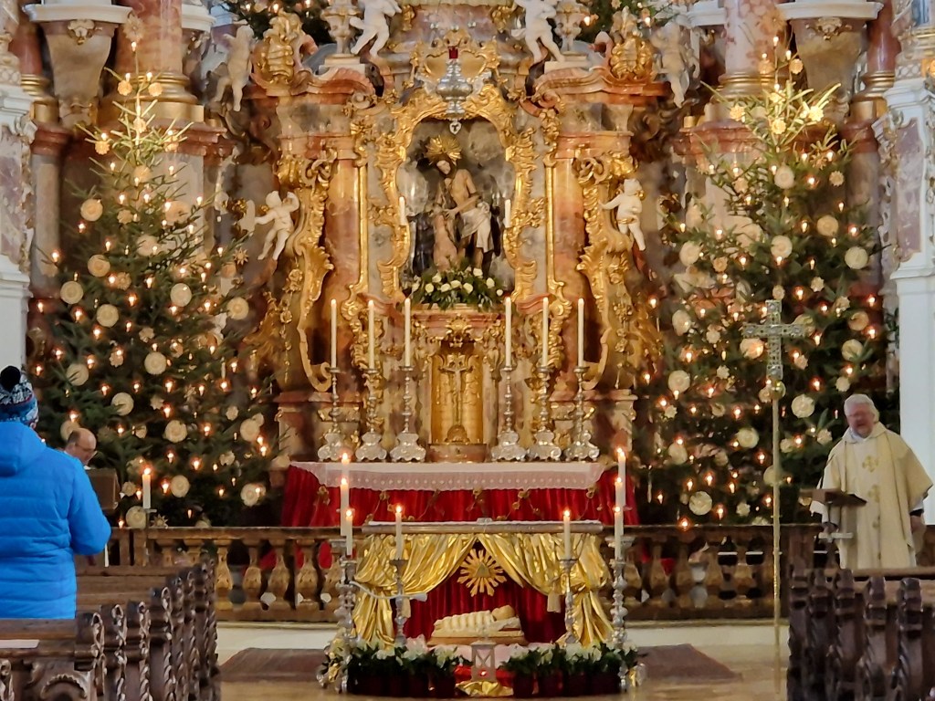Next stop was the Wieskirche. There are more details in the link, but this is an enormous church in the middle of the countryside. It seems out of place, but it is a pilgrimage site that draws many adorers to its wood-carved figure of the Scourged Savior. The Mass was being celebrated while we were there, so we didn’t get to see much, but we did get to light a candle and add our prayers for a moment while adoring the beautiful rococo interior, decorated for Christmas.