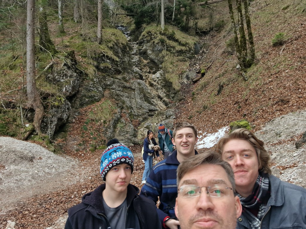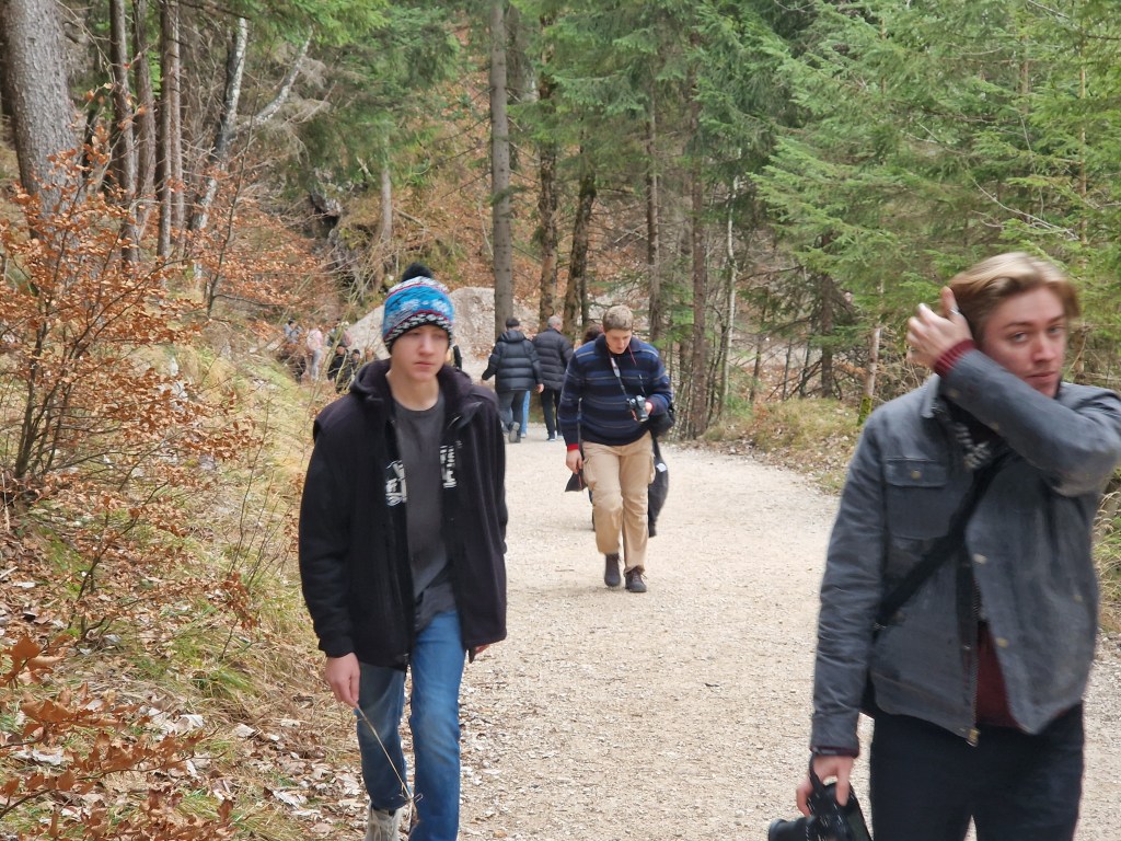 The final stop, and the main reason for our trip, was the Neuschwanstein Castle, probably the most famous in the world, made so because the castles of Disney theme parks were made to look like it. The bus parks at the bottom of the mountain, and from there you can either hike up to the castle or take a bus most of the way. We did both. I took Isaac, Joel, and Matthew with me on what turned out to be a steep and vigorous hike, while Justyn escorted Nora via the bus to where the trail met the road nearer to the entrance of the castle.