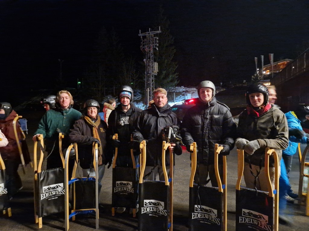 There was only a little time to rest before we headed out on our evening tour to Austria for alpine sledding. This was AMAZING! About three hours of lift time to go up to the top of a ski slope with sleds, and slide down the mountain at excessive, sometimes scary, speeds. Each ride down was about 10 minutes long. Yours truly was the quickest. (And, I insist, it was due to my technique, not any advantage in weight.) It was the best wintertime fun we’ve had in a very long time and everyone’s favorite thing we did this trip.