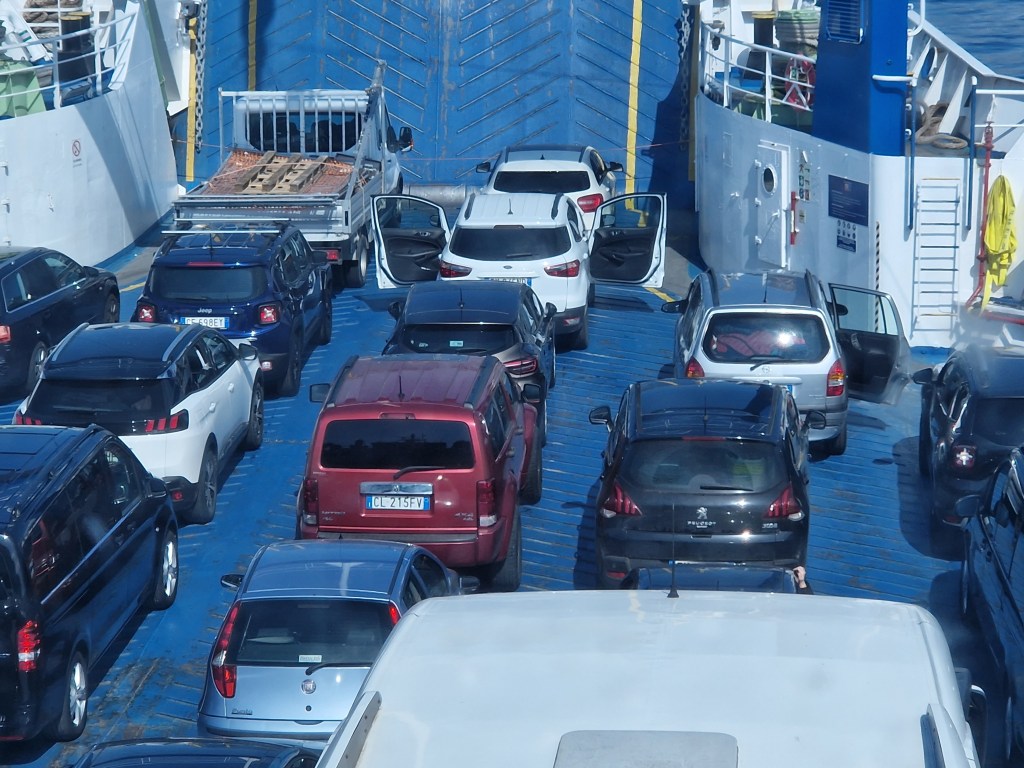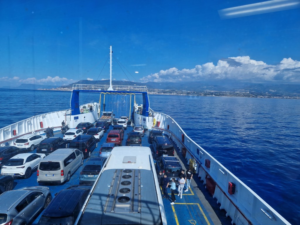 To get to Sicily (Sicilia to the locals), you have to cross the Strait of Messina, and since there’s no bridge there, you have to take a ferry. The entrance for the ferry is easy to find off of the Autostrade (which is the main toll road through Italy), though it requires some winding through the seaport town of Villa San Giovanni. The toll for the Autostrade was remarkably cheap considering the amount of time we travelled on it, and the toll for the ferry also seemed reasonable.