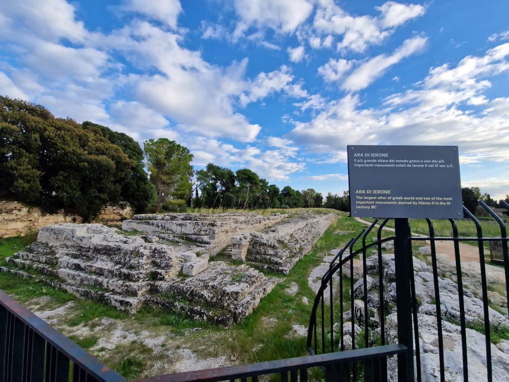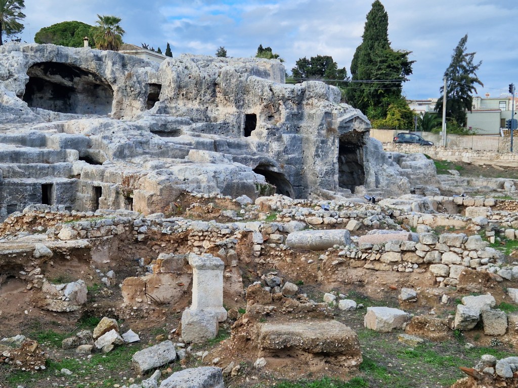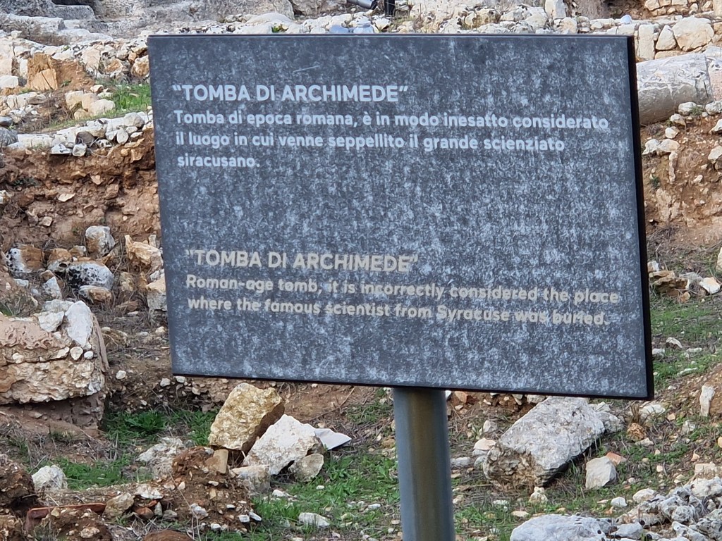 After a quick lunch we drove to Syracuse (Siracusa) to see the home of the great scientist Archimedes. Our first stop was the ancient ruins of his tomb, which turned out to be misidentified (thanks, Google maps). They are certainly Roman era tombs, just not that of the ancient mathematician. By the time we got there the other archeological museums that we went to see were closed. We couldn’t enter, but we did get a few good pictures.