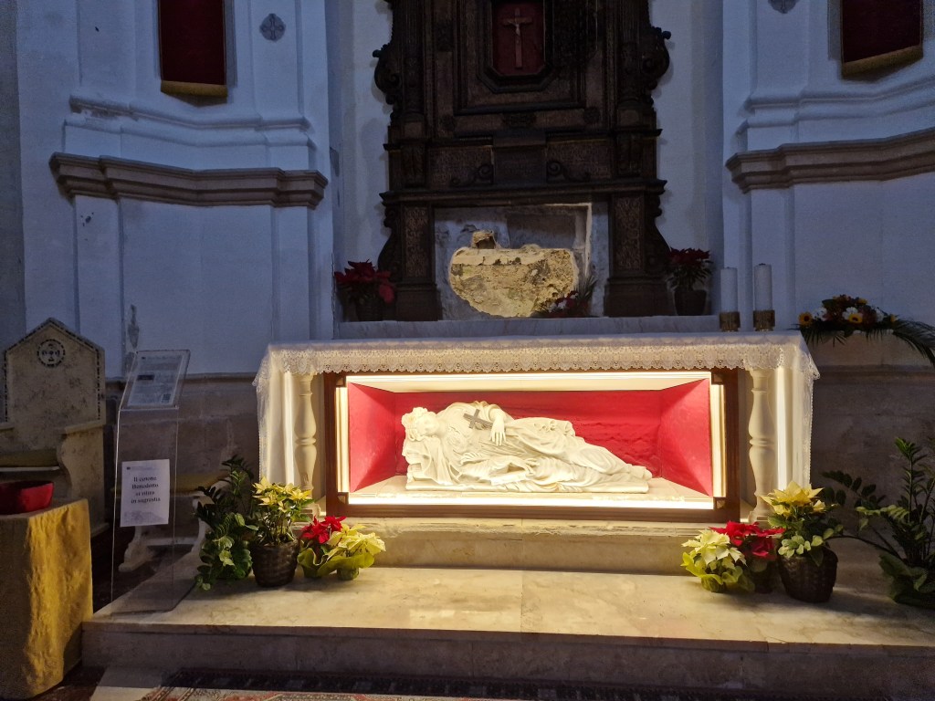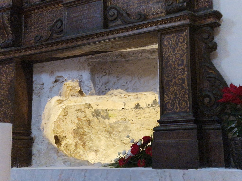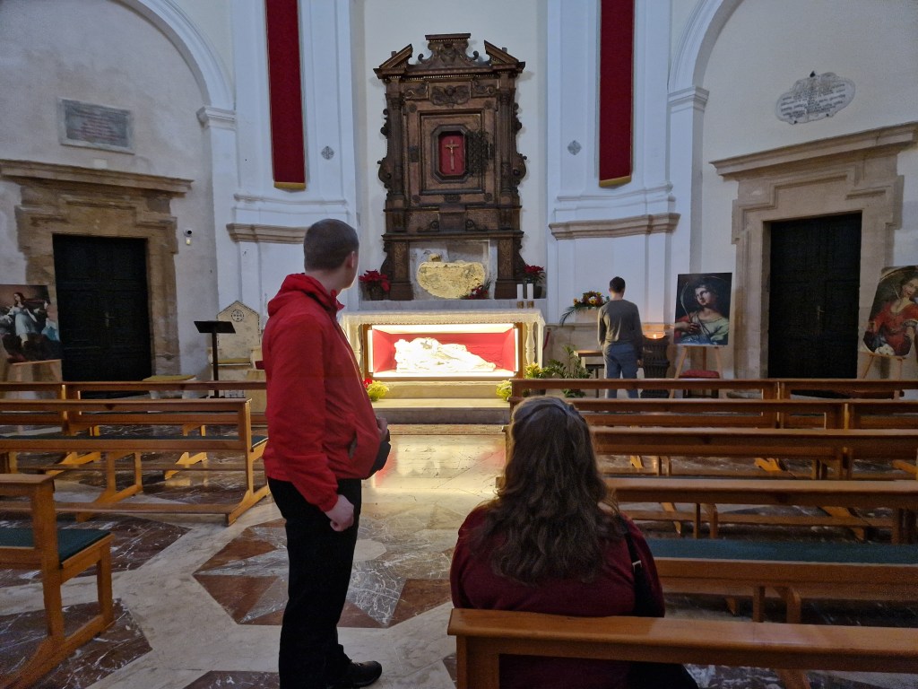 A highlight was visiting the Chapel of St. Lucia, the patron saint of Syracuse. The relics of the saint, martyred during the Diocletian persecution of the early 4th century, were discovered where the chapel is now built. Its antiquity is made obvious by the depth below grade of the chapel’s entrance. Inside is an altar piece with her statue and the excavated cave where they were found.