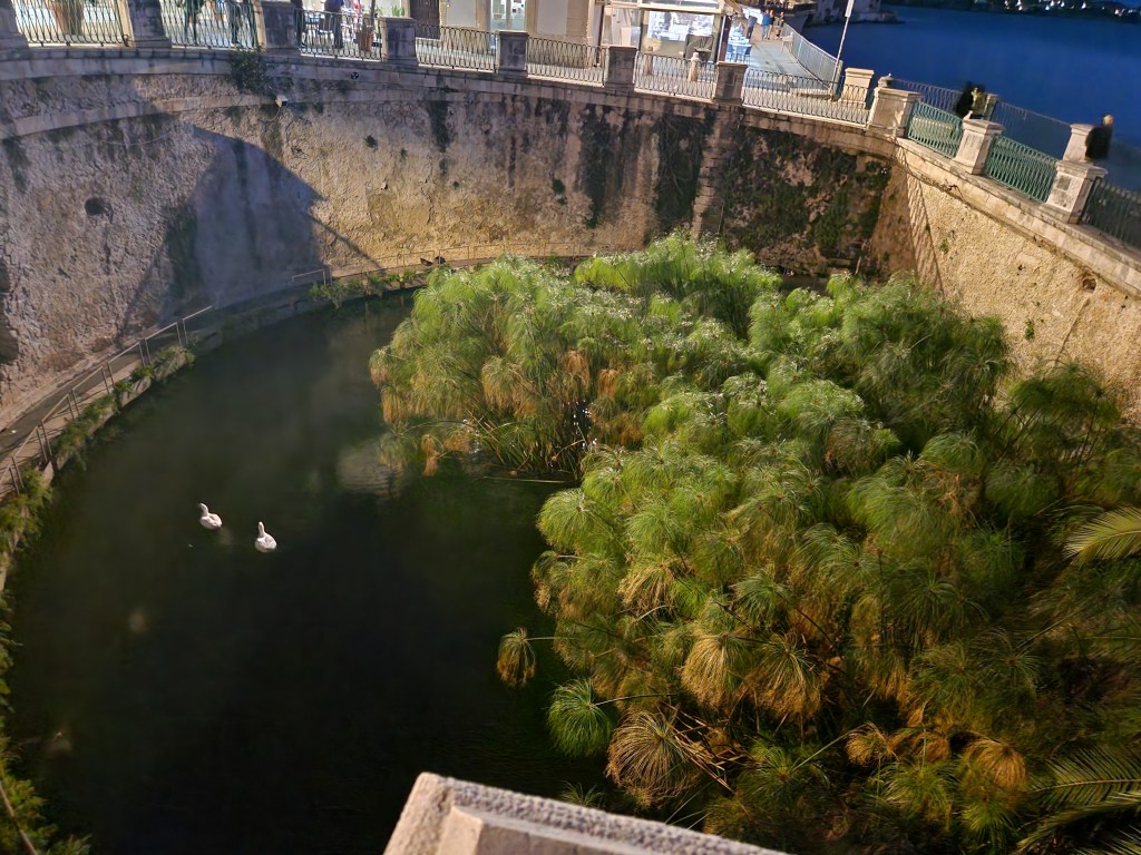 After looking around the cathedral, we went to find the Fountain of Arethusa the freshwater fountain formed, so it is said, when the Greek nymph Arethusa escaped Arcadia under the sea. It is remarkable close to the saltwater bay of Syracuse, separated only by a seawall now, and is one of only three places in Europe (all in southern Italy) where papyrus grows.