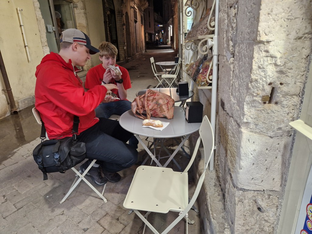 We finished our day in Monreale with dinner across the street at Trinacria , named for the symbol on the flag of Sicily. We ate there because the banner out front said it was street food, and that sounded like just what we wanted, and it was good. We had a collection of fresh baked rolls stuffed with various meats and cheeses, a local favorite, and some fried foods. On our way back to the car we stopped for gelato, because…gelato.