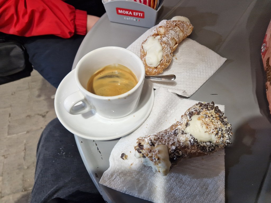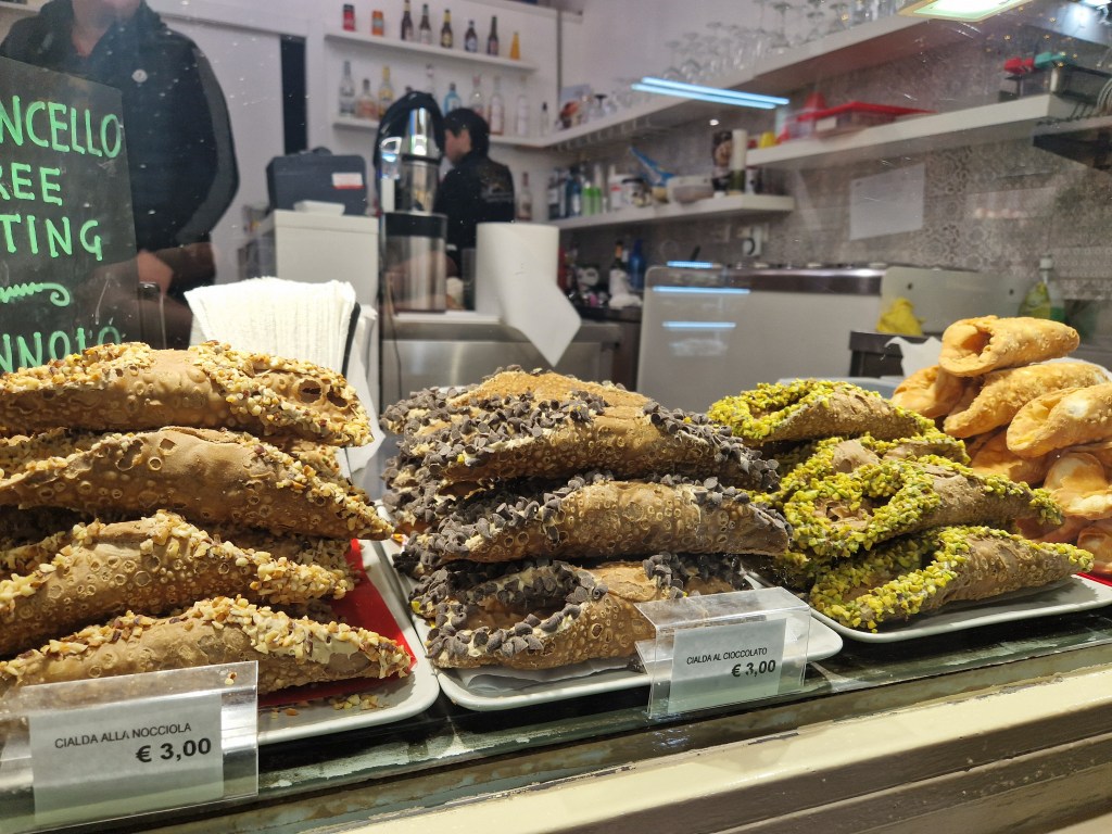 Before we got to the Fountain of Diana we stopped for cannoli, which is the signature pastry of Sicily. The place we got them, Mangano, was next door to a ceramics shop called Kalimera, which we thought was funny. The cannoli and coffee were delicious, and Nora picked up a prickly pear liqueur from their store which, she says, was delightful.